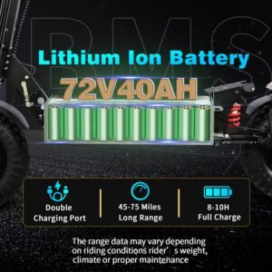 - Off Road Scooter【𝐎𝐕𝐄𝐑𝐒𝐈𝐙𝐄𝐃 𝐁𝐀𝐓𝐓𝐄𝐑𝐘】 It Is Equipped With A 72v 40ah Lithium Battery,Which Can Travel Up To 75Miles Per Charge,With A Charging Time Of 8-10 Hours,This Battery Life Is Very Reliable For Daily Commuting Or Leisure.This Electric Scooter With 14″ off-road tires And Seat Is Suitable For Any Terrain.