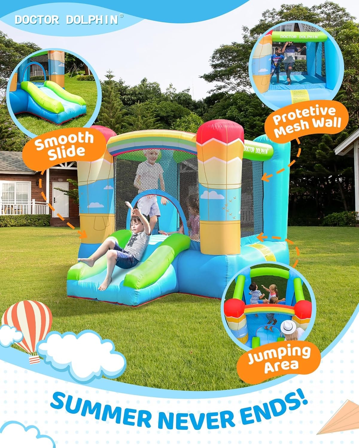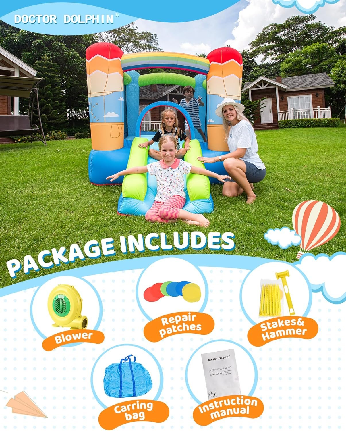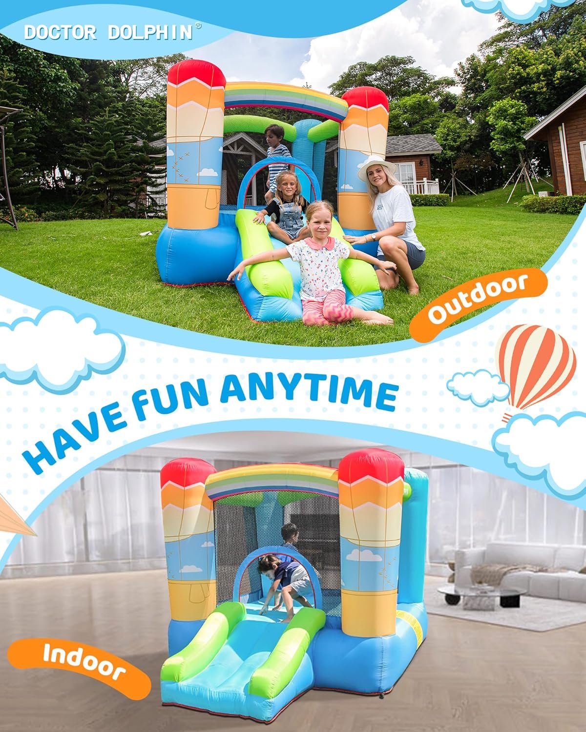 - Diseño infantil: nuestra casa de rebote de diapositivas es el mejor regalo de cumpleaños para tus dulces. El arco iris está arriba, y los globos de aire caliente están a ambos lados de tu hijo.